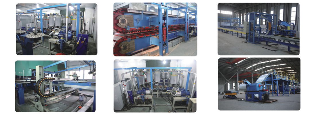 我們公司引進(jìn)意大利賽浦連續(xù)生產(chǎn)線,采用了六組份在線工業(yè)微機(jī)自動(dòng)操作(SIEMENS)混合澆注技術(shù)。生產(chǎn)流程分為開卷覆膜—壓制成型—鋼板預(yù)熱—高壓發(fā)泡—高溫固化—鋸切—板材冷卻—碼垛—自動(dòng)打包等功能與一體的自動(dòng)化生產(chǎn)線,年生產(chǎn)能力為130萬平方米。